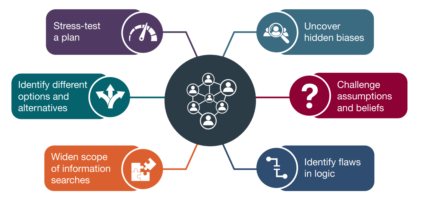 Adopting either a red team approach or a red team mindset can assist both teams and individuals in a number of ways, as discribed on the right. Red teaming can be applied to, and provide benefits for, a range of information processing and decision-making tasks. It can support effective thinking at different stages.